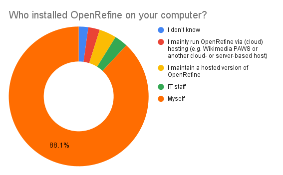 88% of users installed OpenRefine themselves. In contrast, 3% of installations were carried out by IT staff, and 6.64% of users utilize a hosted version (2.65% of users maintain a hosted version, while 3.98% use it). The percentage of users running or maintaining a cloud version has decreased compared to 2022, when 5% were cloud users and 5% were maintainers.