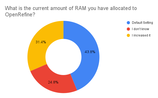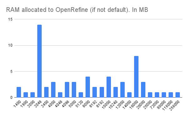 In 2024, we introduced a new question to understand how much RAM users have allocated to OpenRefine. The larger the dataset (in terms of rows and columns), the more RAM OpenRefine will need to process it. This question serves as a proxy to evaluate how scalable OpenRefine should be and the technical savvy of our users since increasing the RAM required advanced configurations.